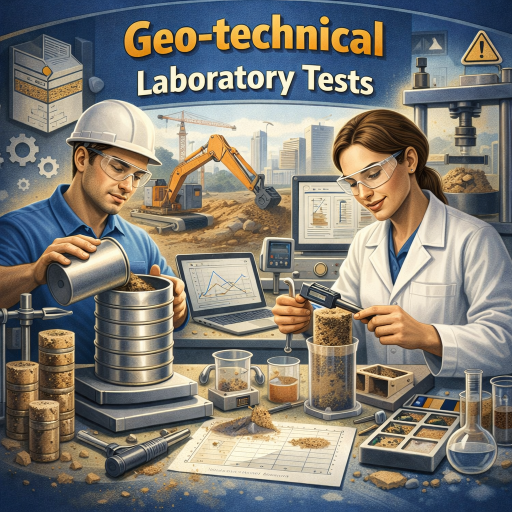 اجرای آزمایشهای لابراتواری خاک جهت تعیین خصوصیات فزیکی و میخانیکی خاک، از جمله دانهبندی، حدود اتربرگ، تراکم و مقاومت خاک. نتایج این آزمایشات مبنای مهمی برای طراحی مطمئن تهداب ساختمان میباشد.