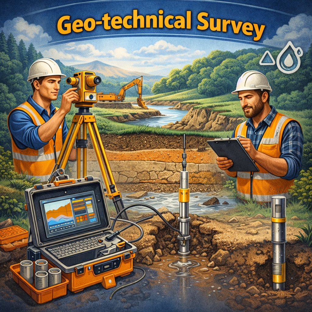 انجام سروی دقیق جیو تخنیکی زمین بهمنظور بررسی شرایط طبیعی ساحه پروژه، تعیین مشخصات خاک و جمعآوری معلومات لازم برای طراحی تهداب ساختمان. این سروی با استفاده از تجهیزات مدرن مانند GPS و Total Station انجام میشود تا معلومات دقیق و قابل اعتماد برای مراحل بعدی طراحی فراهم گردد.